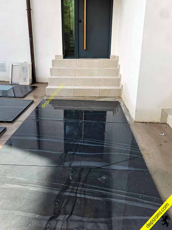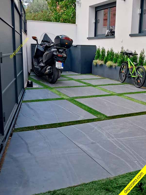 Las losas de pizarra natural son robustas y perfectas para caminos principales, mientras que las plaquetas y baldosas ofrecen opciones para senderos más decorativos o secundarios. Las placas grandes funcionan bien en áreas de tránsito intenso. Este material destaca por su resistencia al clima, su bajo mantenimiento y su capacidad para integrarse armoniosamente con el entorno.