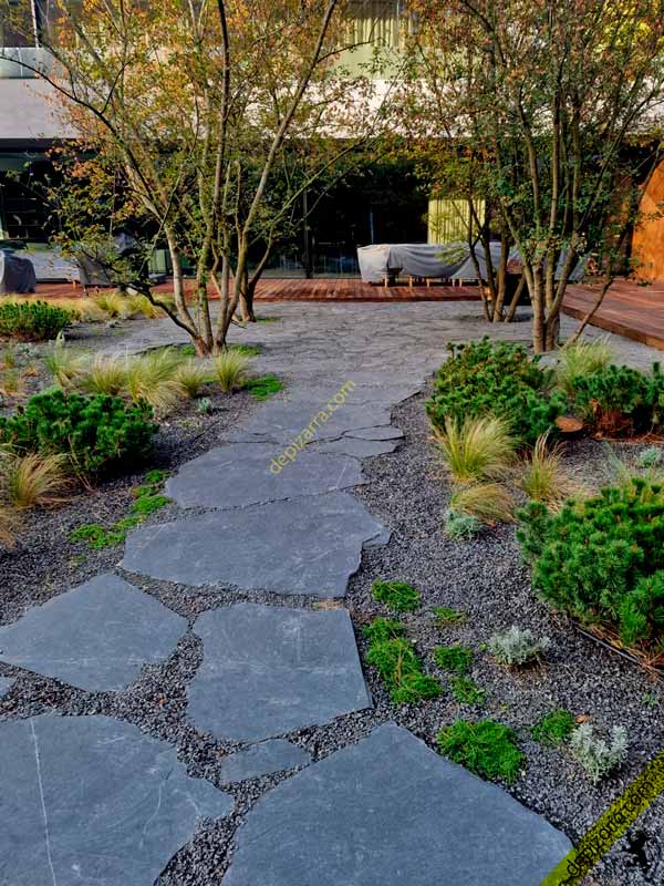 Este material no solo brinda una apariencia única con sus tonos profundos, sino que también ofrece durabilidad y resistencia a la intemperie. Resistentes y duraderas losas de pizarra para jardín y exterior para paisajismo